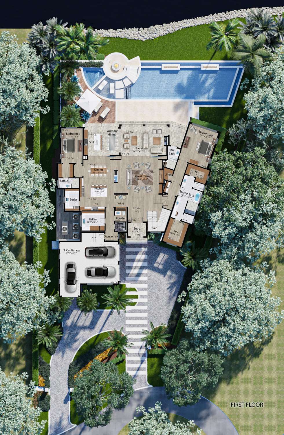 An exciting New Construction opportunity in Port Royal with 140 feet of water frontage and Completion this April! This A. Vernon Allen – Jon Kukk – Lisa Kahn collaborative has a coastal yet modern design and features a show-stopping 80-foot pool and spa complex with a 3-sided infinity spill-over edge, linear fire features, sun shelf, Brazilian hardwood decking and an embedded firepit. Sliding glass doors pocket away for a seamless transition from the expansive outdoor area to a spacious interior which includes: 2 sumptuous primary suites (one upstairs and one downstairs), 4 guest suites, 60kW generator, thoughtfully placed wood accents, an elevator, built-in wine nook, and an extended lanai with an outdoor pool bath. This magnificent property exudes quality and is enveloped by lush, tropical landscaping. With a cul-de-sac location providing extra privacy you'll feel as though you’ve entered your own secluded resort; a world unto itself. This property provides Port Royal Club membership eligibility.